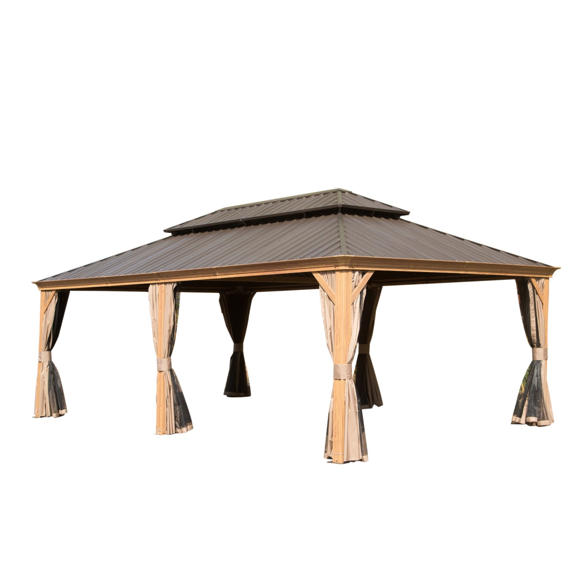 14x24FT Hardtop Gazebo, Outdoor Gazebo with Galvanized Steel Double Roof, Aluminum Frame, Built-in Gutter System, Curtain and Netting, Metal Gazebo Pavilion for Patio Deck Garden, Wood-Looking
