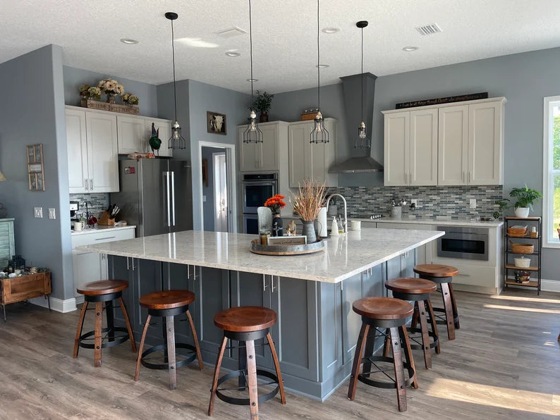Upgrade your bar or kitchen seating with this handcrafted whiskey barrel stave swivel bar stool — combining authentic barrel materials with smooth, functional comfort.